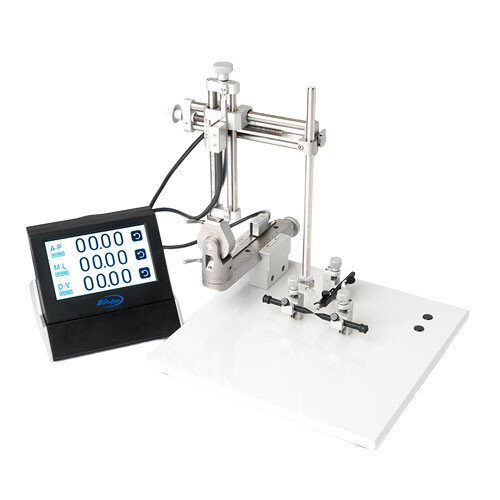The small size, one of the smallest on the market, is ideal for laboratories with small spaces or for use in surgical suites that require transportation of equipment to and from surgical facilities. A zeroing function allows the user to target specific coordinates in the brain for injection, implantation, etc. Calculation of distance measurements is thus no longer necessary...saving valuable time and improving accuracy.