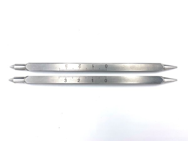 Ear Bars have laser-engraved scales, 50mm of calibration and are 6.2 mm square. New Standard and Lab Standard series Ear Bars have a different zero point than those for the 51800 series. Standard (18°) Ear Bars taper at the tip to penetrate far into the ear canal for a more secure hold. Non-puncture Ear Bars have a 45° taper and do not puncture the tympanic membrane.