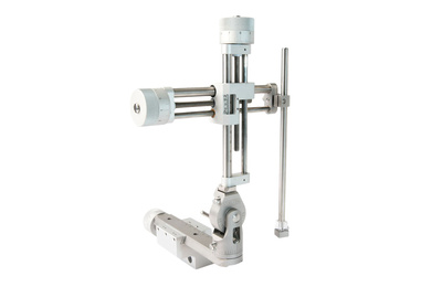 The manipulator arm controls medio-lateral and vertical positioning via lead screws, and antero-posterior movement via dovetail slide movement, with 80 mm of travel possible in each direction. A Universal Joint allows the investigator to change the angle of the probe up to 90o in either the antero-posterior or medio-lateral planes. The locking mechanism on tarm will hold any angle position without slippage. And of course, it also provides an absolute lock at 90o vertical.