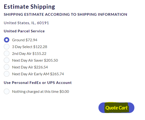4. Click "Quote Cart." You will be directed to a screen to enter all shipping and billing information. All fees, including shipping and tax, will be generated and applied at this screen. Choose the desired shipping method.