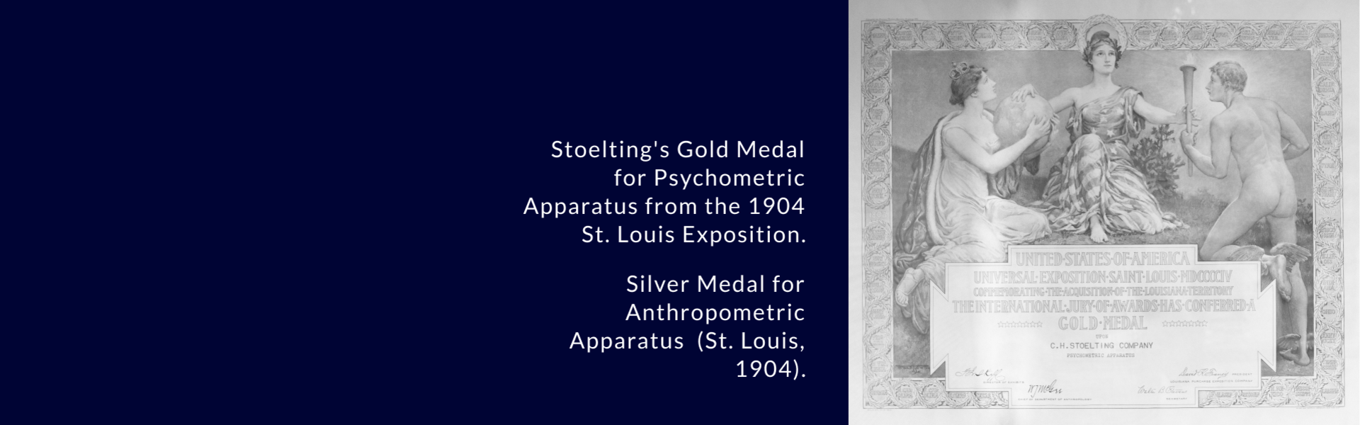 In fact, from 1903 to 1943, Stoelting was nearly unchallenged as the principal provider of the material culture of American psychology. And at the St. Louis Universal Exposition of 1904, C.H. Stoelting Co. was awarded Medals for Anthropometric Apparatus and Psychometric Apparatus, awards that hang on our walls to this day.